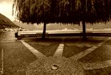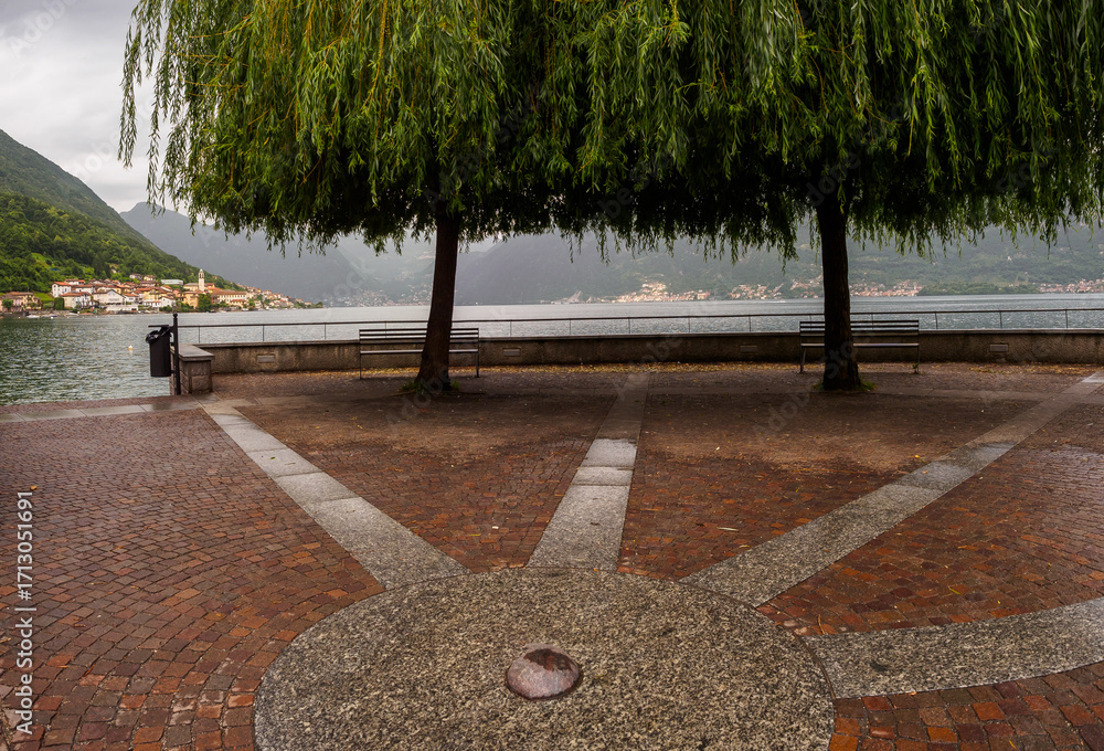 Peaceful Lakeside Platform with Benches and Trees Overlooking Soothing Lake Como Scenery