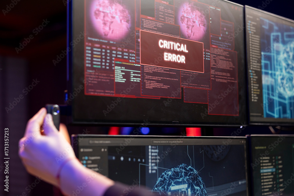 Hacker sees critical error popup on PC after inserting USB stick with malware to breach company servers. Evil man seeing failure alert message when inserting flash drive in computer