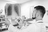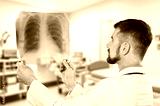 Senior doctor hold xray for thinking in clinic