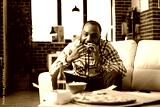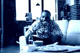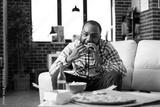 Black male freelancer taking break from work, sitting on couch and enjoying slice of pizza. Relaxed african american man watching movie or show at home with takeaway meal in hand.