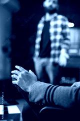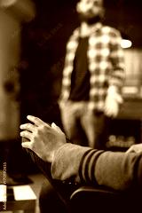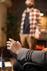 African American male therapist seated with crossed legs, listening attentively to client. Close up of hand resting on knee as Caucasian man speaks during private clinic therapy session.