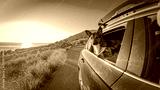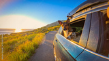 CLOSE UP, LENS FLARE: Two dogs happily look out of a car window, enjoying the fresh air and stunning sunset views over Adriatic Sea as the car drives along a scenic coastal road on island of Hvar.
