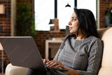 Indian businesswoman sits on sofa, looking towards window with pensive expression. Female freelancer pauses from remote work on laptop, reflecting on business ideas in brick wall apartment.