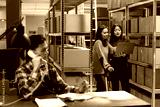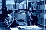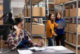 Asian woman on crutches works in a supply room shipping area, helping manage orders packages and product handling. Home business warehouse supports accessible inventory operations.