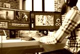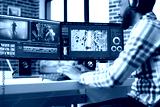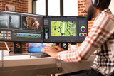 Videographer with headphones edits cinematic content, syncing audio with footage, applying color grading and transitions. Post production coordinator reviewing film montage in home studio with music.