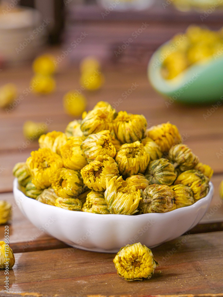 Dried Chrysanthemum Tea Flowers from Hangzhou Tongxiang China in White Bowl on Wooden Background