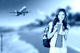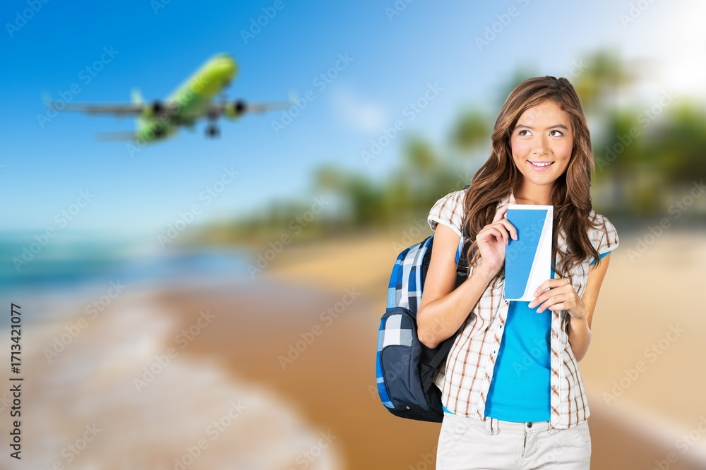 Woman traveler with suitcase on summer beach
