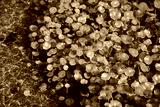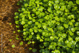 Green Asiatic pennywort or Centella asiatica leaves with fresh water droplets growing beside a clear stream with pebbles at the bottom.