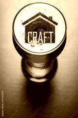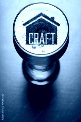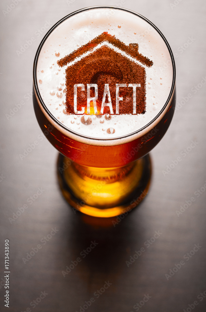 Local craft beer. House silhouette in glass of fresh beer on pub table, view from above