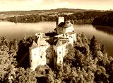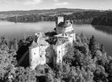 Poland. Medieval Castle in Niedzica,14th century (upper castle), Polish or Hungarian in the Past. Artificial Czorsztyn Lake and far view of the ruins of Czorsztyn castle. Aerial view in the morning