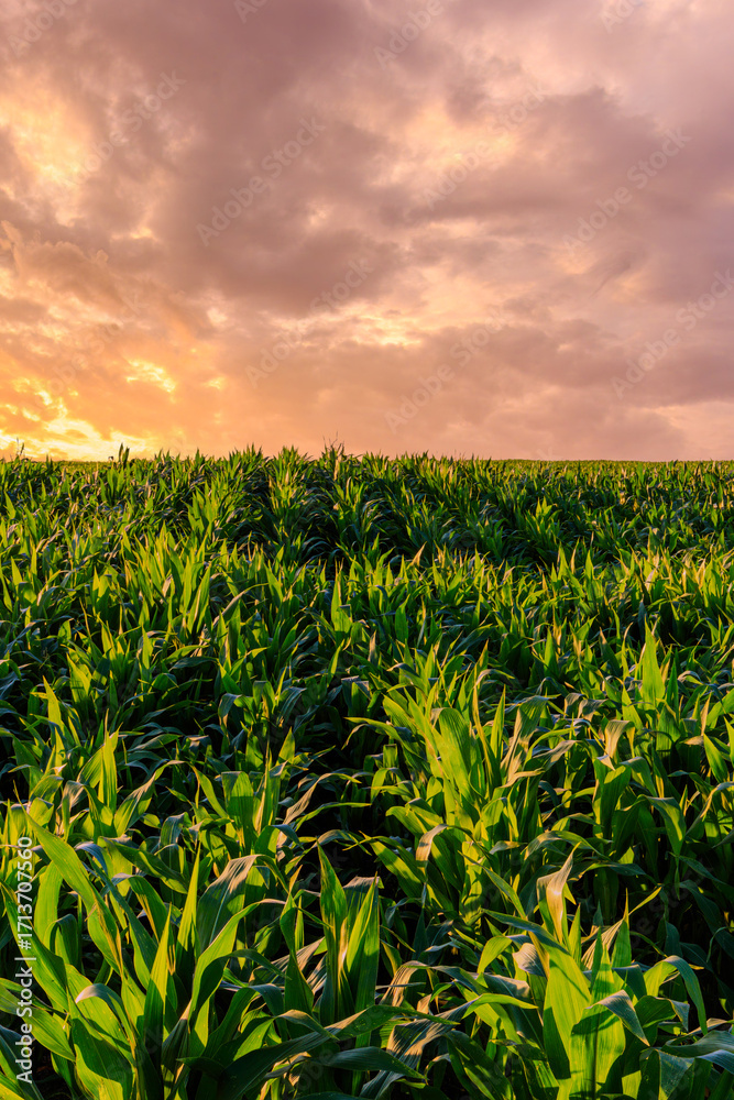 Green corn field with a radiant sunset over the horizon, capturing agricultural growth and the beauty of rural landscape.