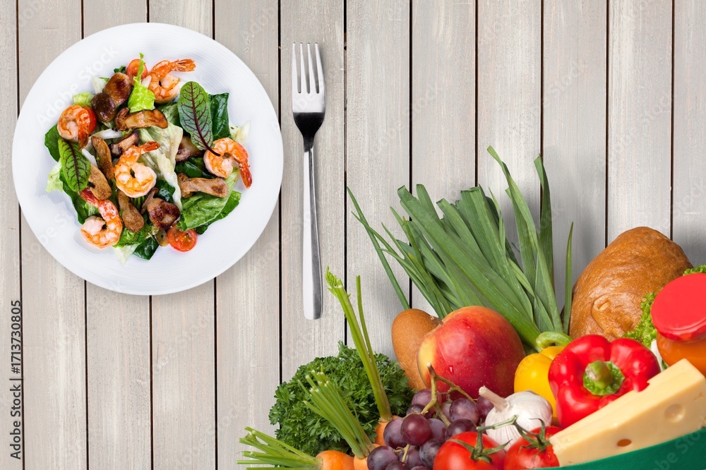 Tasty fresh ripr fruits, vegetables on desk