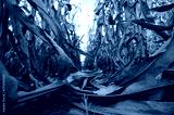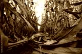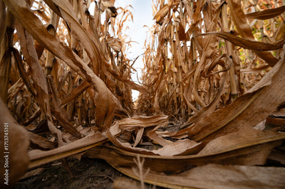 Dry corn stalks standing in midwest harvested autumn field