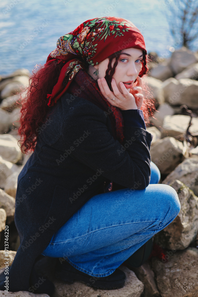 Bohemian Woman with Red Floral Headscarf Sitting on Rocks by the River
