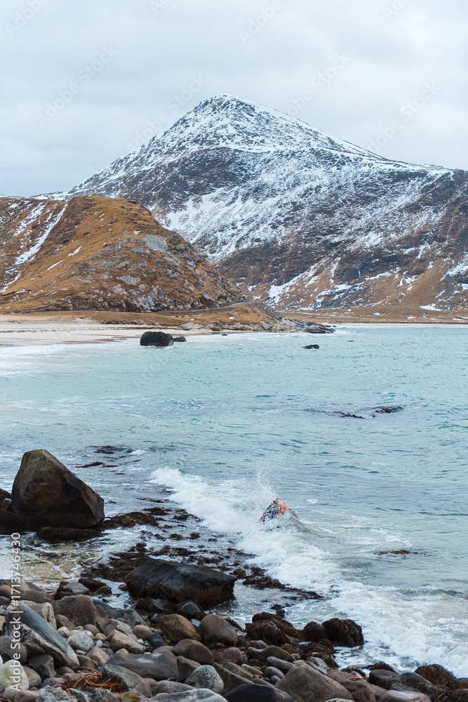 Snowy Mountain and Rocky Beach Scene