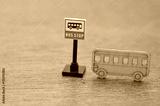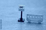 a toy bus and a bus stop sign effectively represents the routine of public transit, waiting, and city travel in a minimalist style.