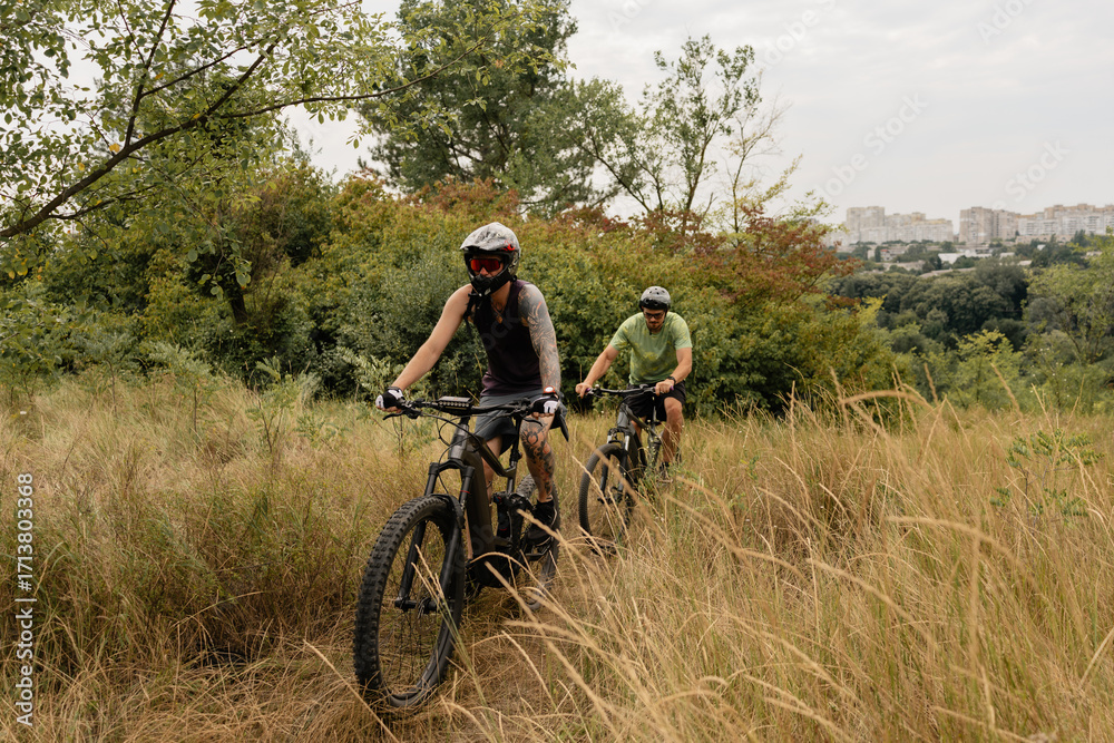 Two mountain bikers riding through a forested trail near an urban landscape