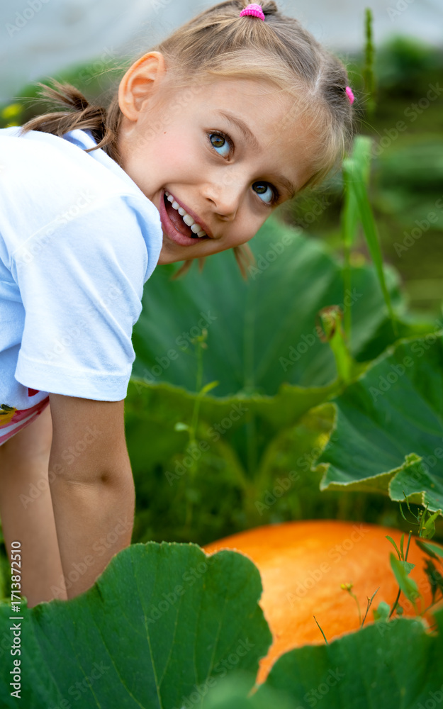 Portrait of happy girl with big orange ripe pumpkin in autumn garden. Growing vegetables. Gardening harvesting farming agriculture.