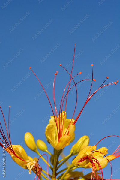 Bird of paradise yellow flowers against blue sky - Latin name - Caesalpinia gilliesi