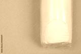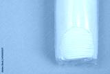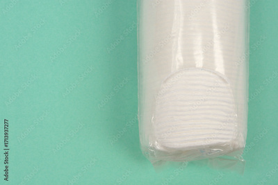 A close-up shot of a clear plastic package containing a stack of white cotton pads, positioned on a light green background with copy space