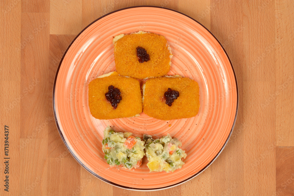 A studio image of three fried, breaded Trappist cheese pieces with wild berry jam and a serving of potato salad on an orange plate