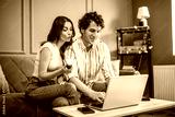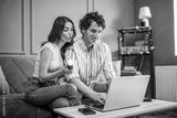 Adult couple sitting on bed in living room and having online doctor's appointment using laptop.