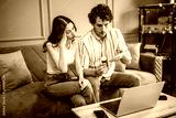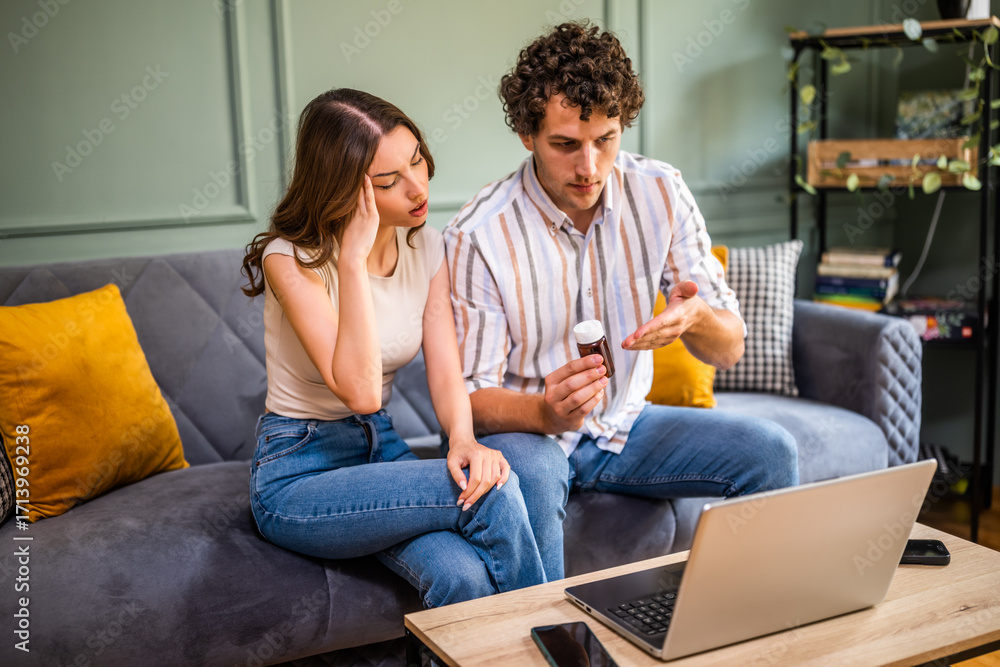 Adult couple sitting on bed in living room and having online doctor's appointment using laptop. Woman having headache. Remote consulting with doctor.