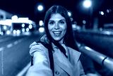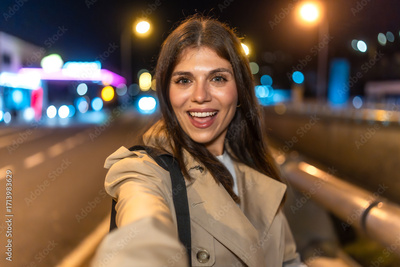Smiling woman taking selfie on city street at night