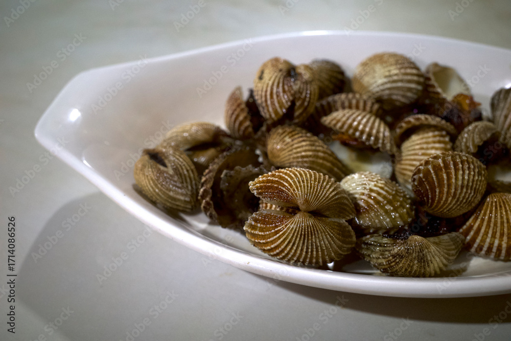 Kerang or Scallops, blood cockles or blood clams (Anadara granosa) on a white plate in the restaurant in Yogyakarta, Indonesia