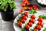 Caprese salad - mozzarella basil and tomato skewers, italian food and healthy vegetarian diet concept