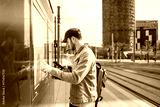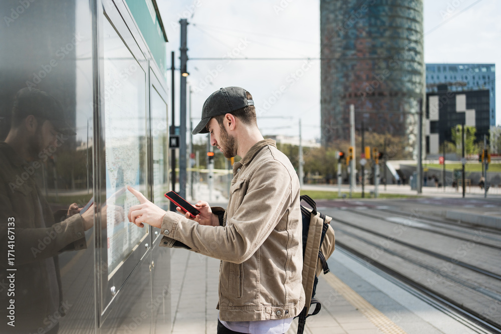Young male student buying transport pass at urban tram train station using mobile phone app and ticket machine