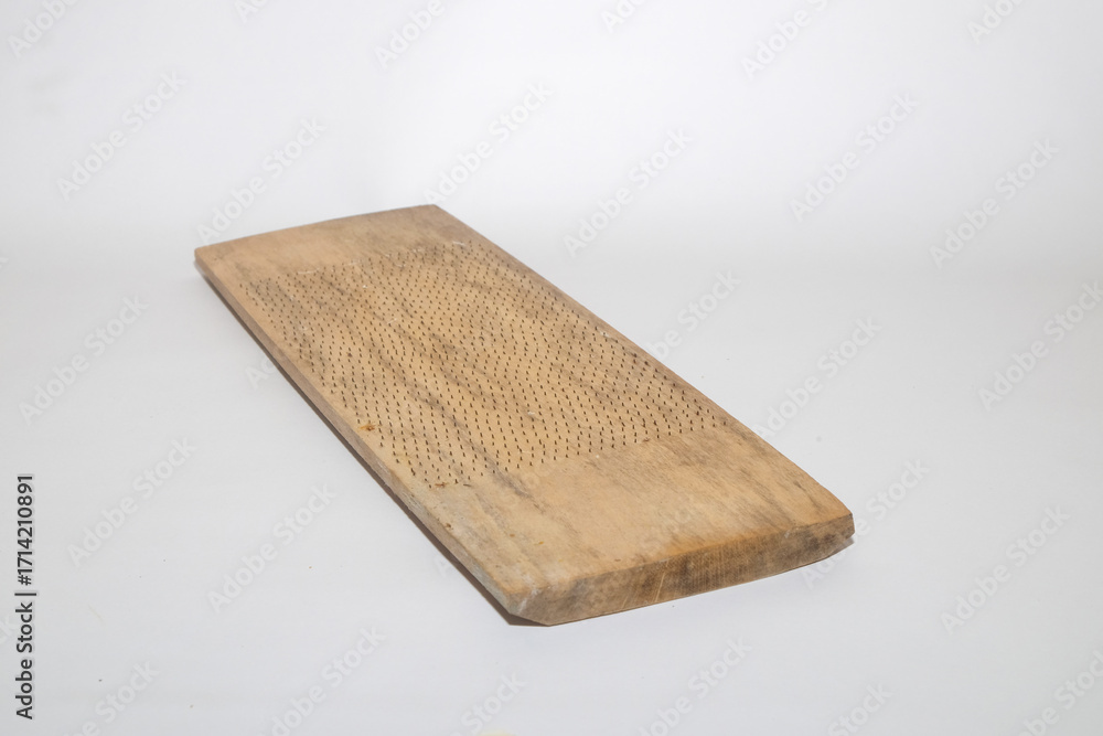 Close up of traditional coconut grater made of wood isolated on white background.Copy space for text.For graphic design,3D rendering and banners