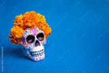 Decorated skull with marigold flowers on blue. Dia De Los Muertos holiday.