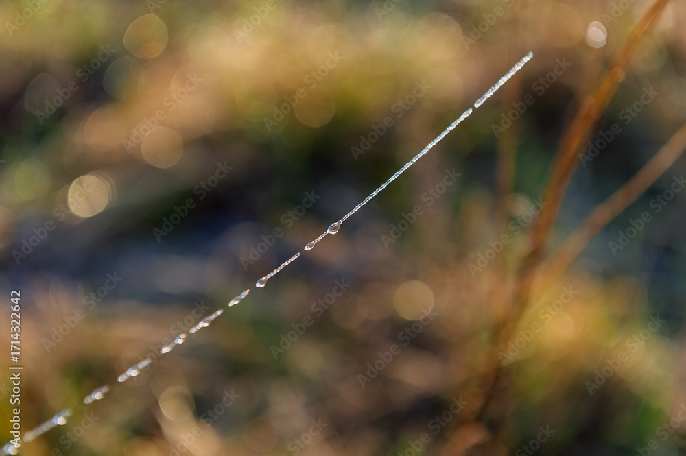 Water drops on a spider web against a blurred background.