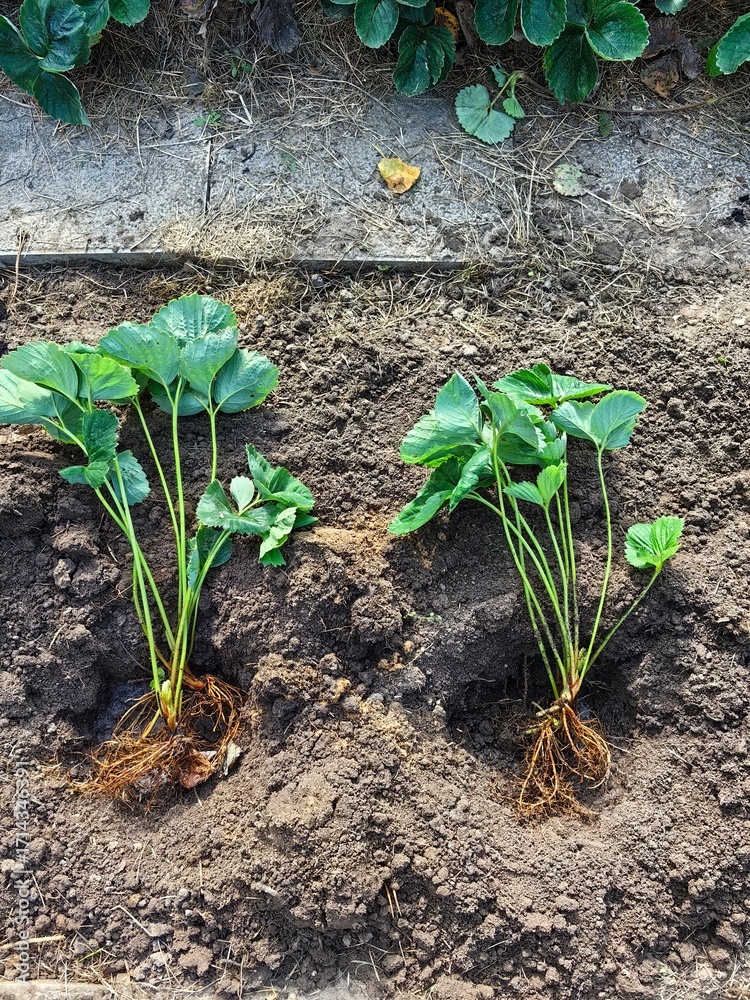 Strawberry seedlings are ready for planting. Berry bush runners in the garden in autumn.