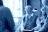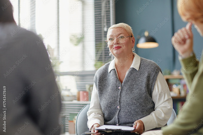 Caucasian woman wearing glasses leading group discussion with two people in modern office setting, holding clipboard and smiling while engaging participants