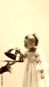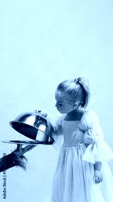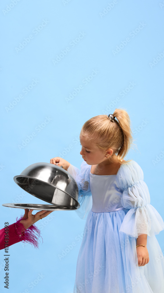 Little girl in blue dress curiously looking under silver serving dome. Concept of childhood wonder, festive dining, elegant event presentation, and luxury hospitality service.