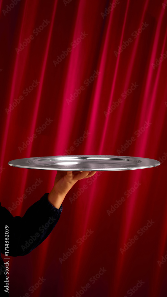 Empty silver tray held by hand against red curtain backdrop. Concept of service, branding presentation, elegant catering, and premium stage setup for product or event advertising. Copy space for ads