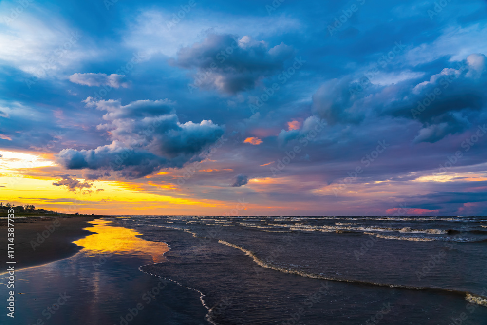 Beach at sunset with beautiful clouds and slightly stormy ocean