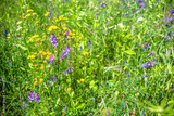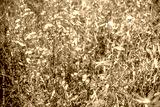 Natural background with blurred meadow and flowering grass, closeup, selective focus.