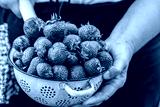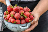 Freshly picked strawberry. Farmer's hands with harvested strawberries. Farm fresh produce from the garden, organic farming and bio food concept.