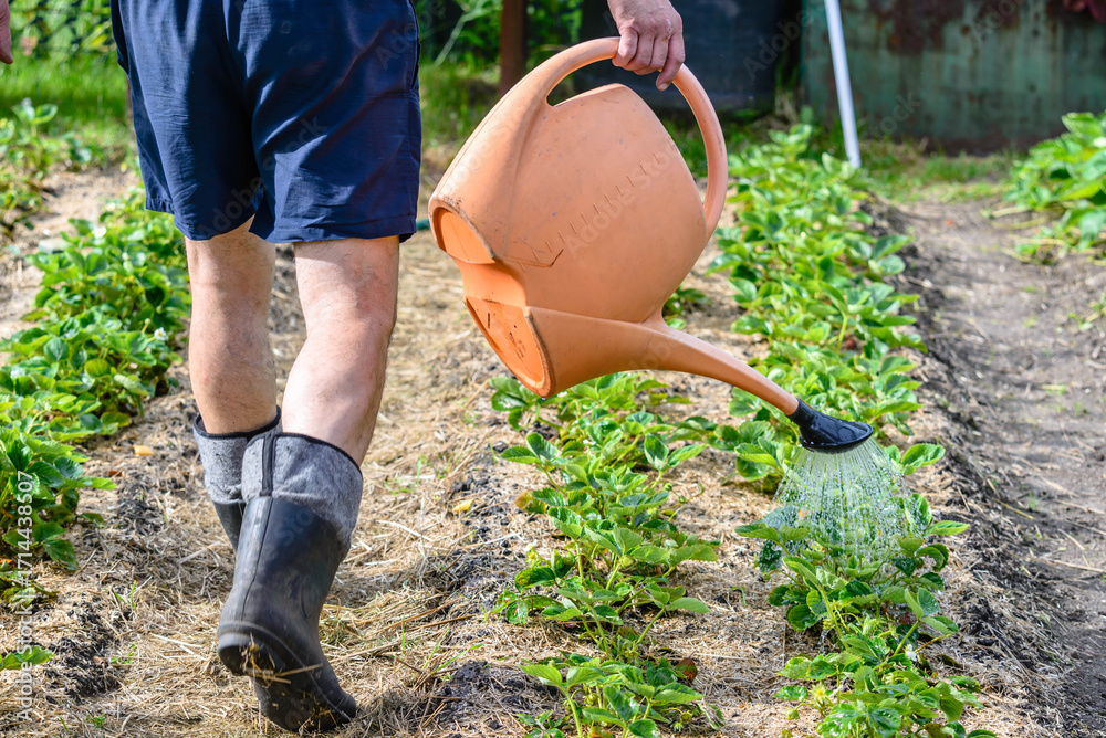 Farmer water plants in the garden with a watering can. Bio organic gardening concept.