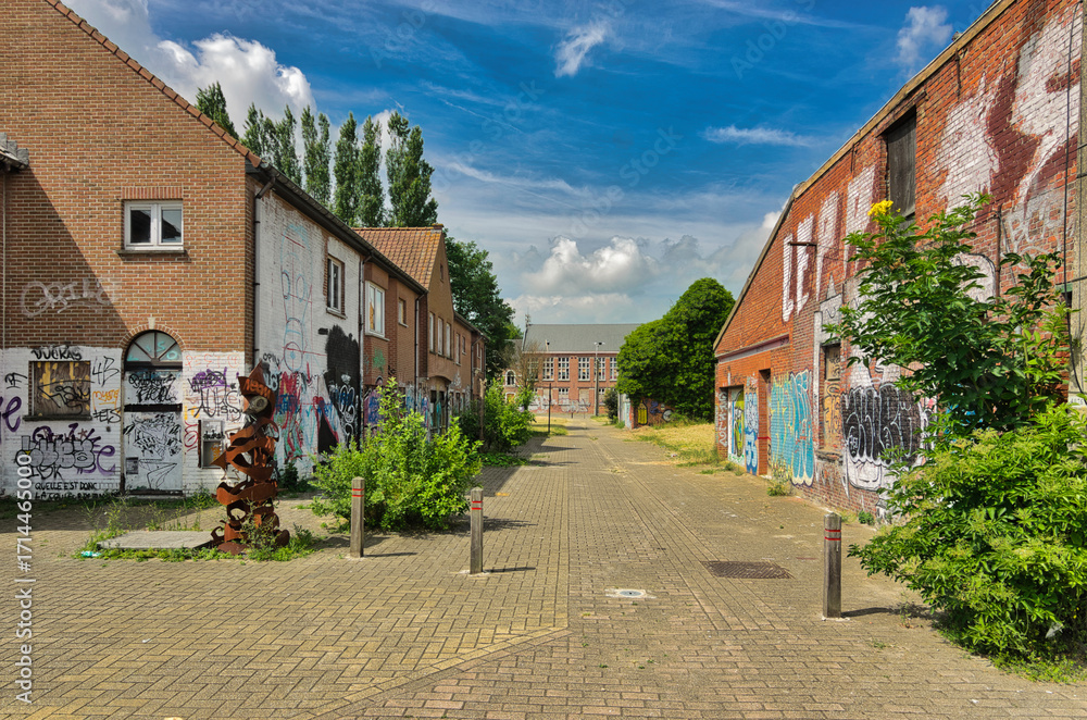 Deserted street in Doel, Belgium showing boarded-up houses decorated with graffiti and street art. The abandoned village represents urban decay and forced depopulation.