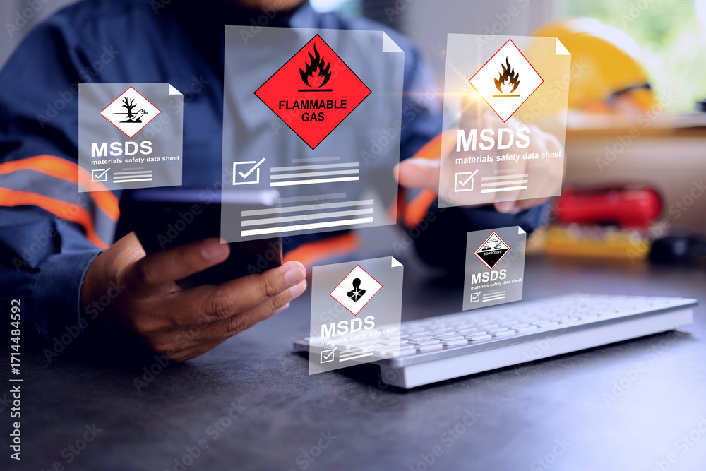 Flammable gas and hazardous substance concept with safety staff pointing on MSDS or materials safety data sheet dangerous goods detail on working desktop to categorize for shipping and storage area