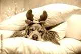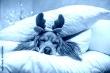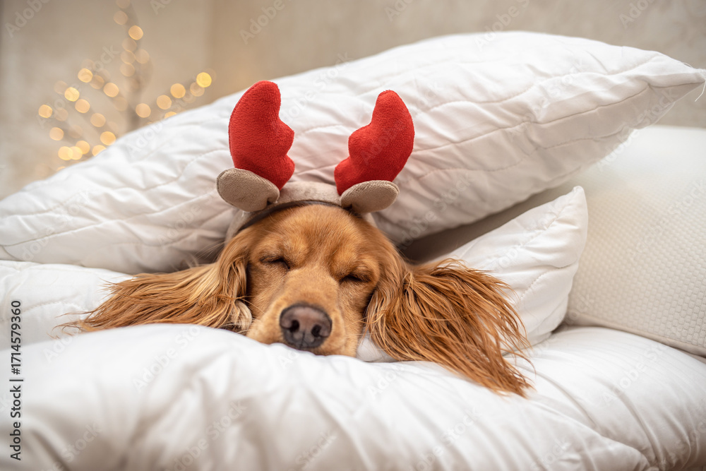 Adorable dog with reindeer antlers sleeping on cozy white pillows, Christmas holiday concept