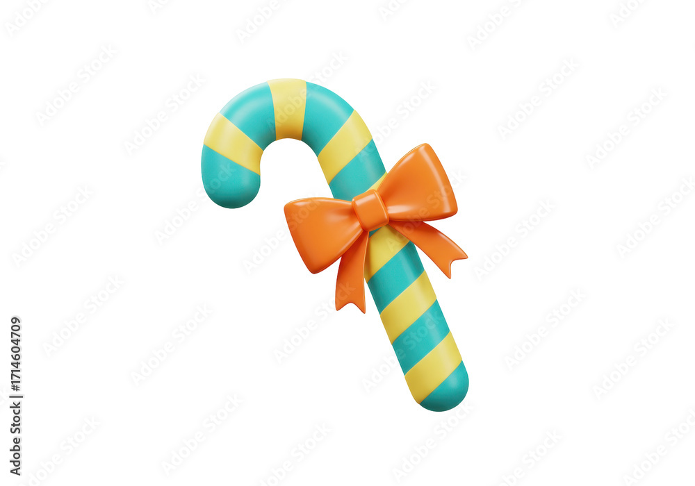 Isolated festive candy cane with orange bow and yellow-blue stripes for winter holidays