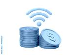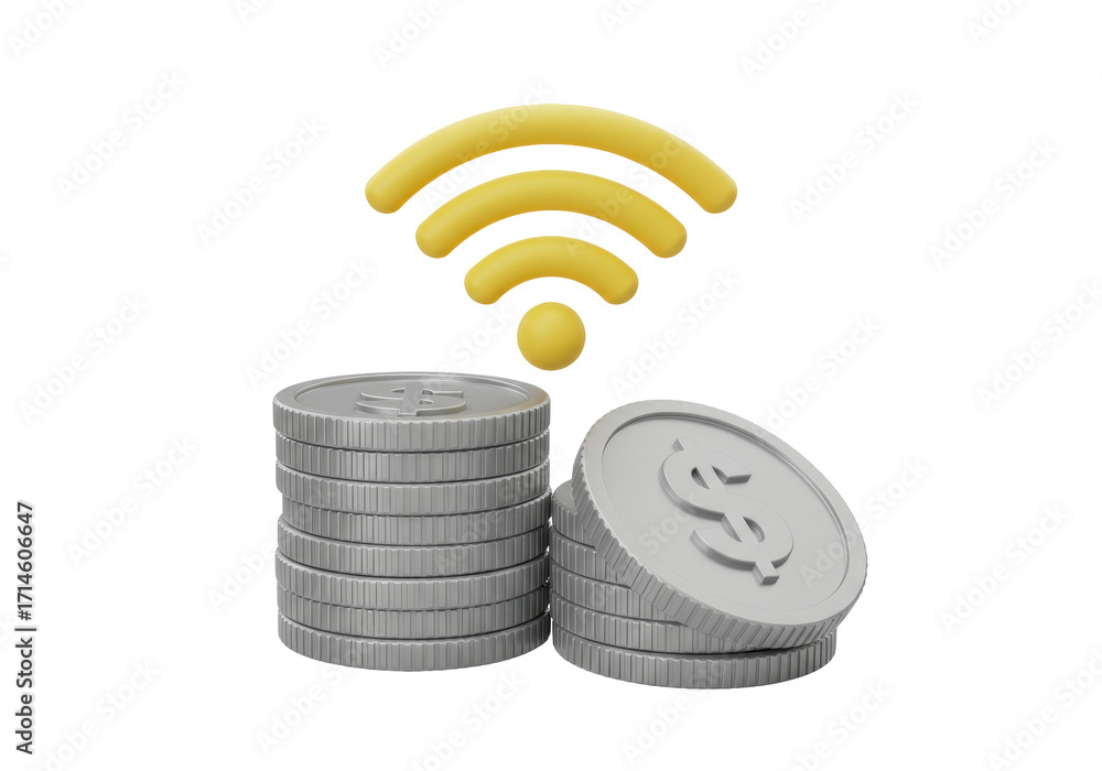 Isolated money coins with golden wifi symbol for online payment success or financial freedom