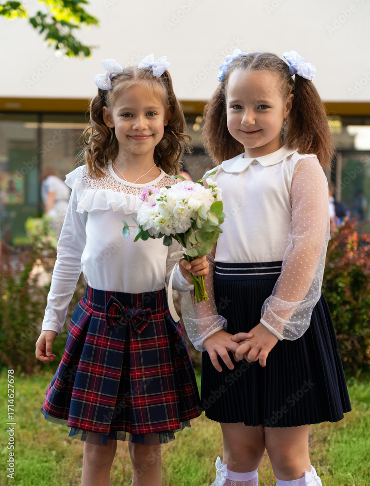 Happy schoolgirls with bouquet flowers on background of school outdoors. Girlfriends students on September 1. Pupil schoolmate education. Back to school. Knowledge Day