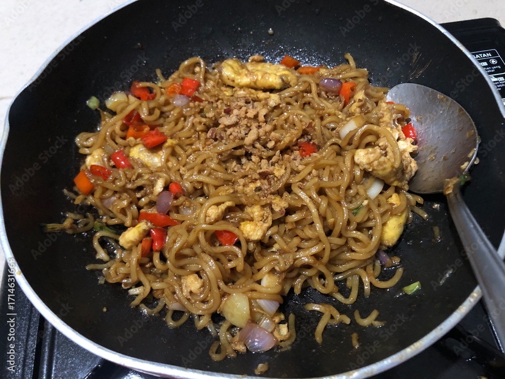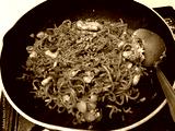 Stir-fried noodles with vegetables and tofu being cooked in a wok
