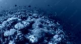 A vibrant coral reef ecosystem teeming with colorful fish and diverse marine life in crystal-clear blue waters.